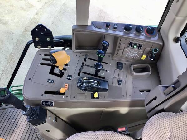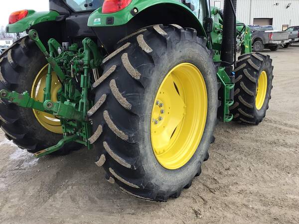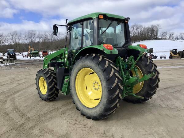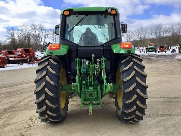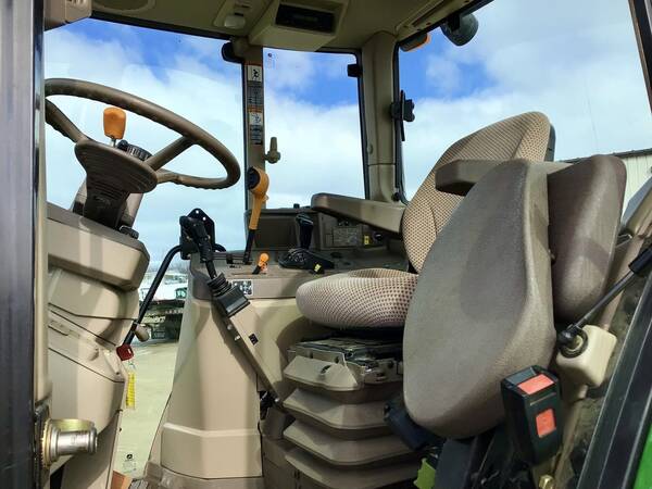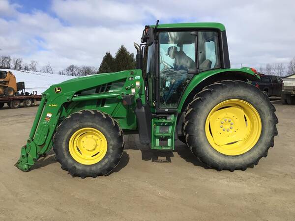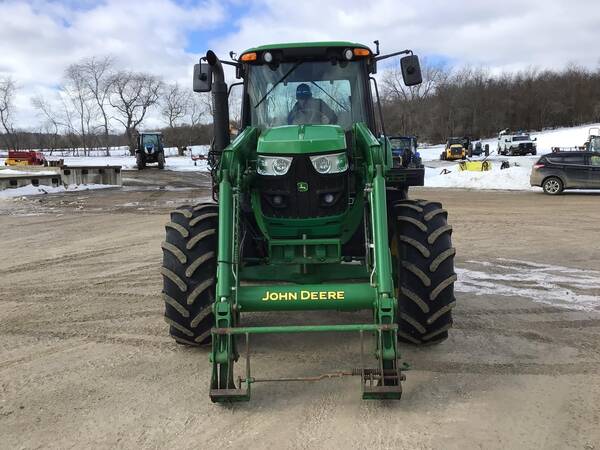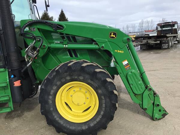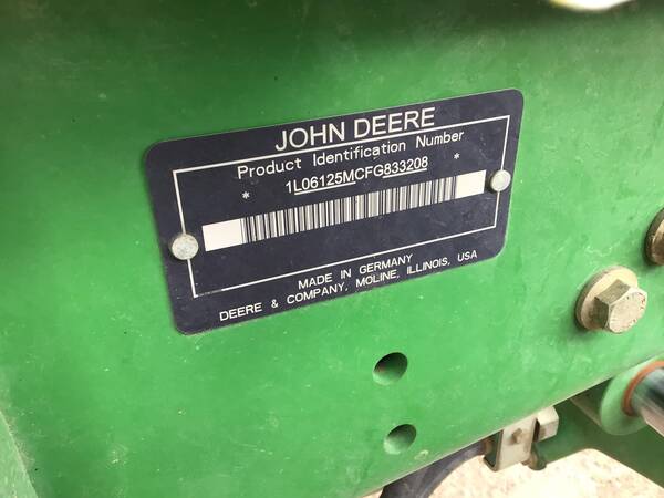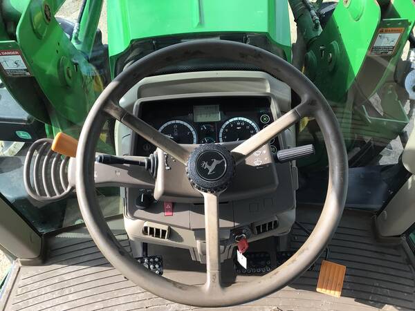 2015 John Deere 6125M 4WD with John Deere H340 loader. 2695 hours. Very nice condition and operates well. Cab/Heat/Air & instructors seat. 125 engine HP producing 102 PTO HP with a 24 speed Power-Quad Plus transmission with a left hand reverser. 24 forward gears and 24 reverse. 3 point hitch, 540/1000 rear PTO both with fender controls & 3 rear hydraulic remotes. 480/70R38 rear tires & 420/70R24 front tires.