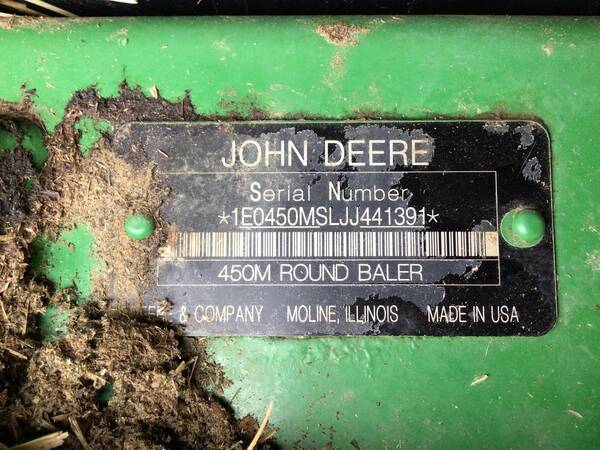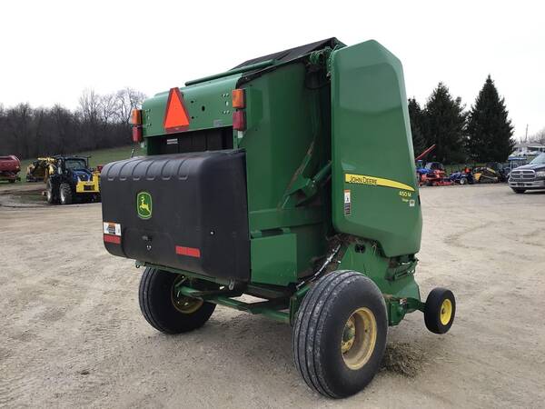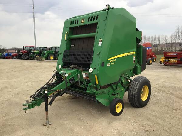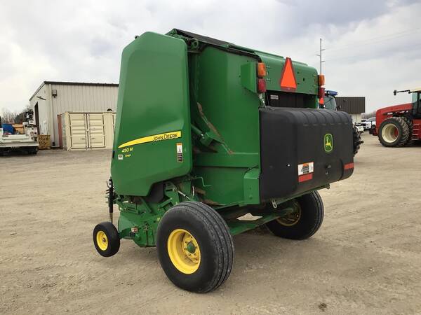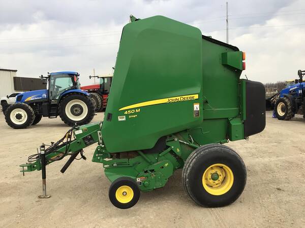 John Deere 450M Silage Round Baler. Only 3200 bales. Very nice but needs a bath. Makes 4’X5’ bales, net wrap, gauge wheels, 540 PTO. Comes with monitor.